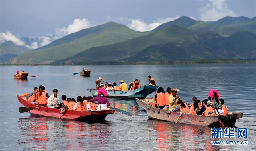 游客在瀘沽湖上坐船游覽(7月30日攝)。如今寧蒗永寧鄉落水村的摩梭群眾靠旅游服務實現脫貧致富。 新華社記者 藺以光攝
