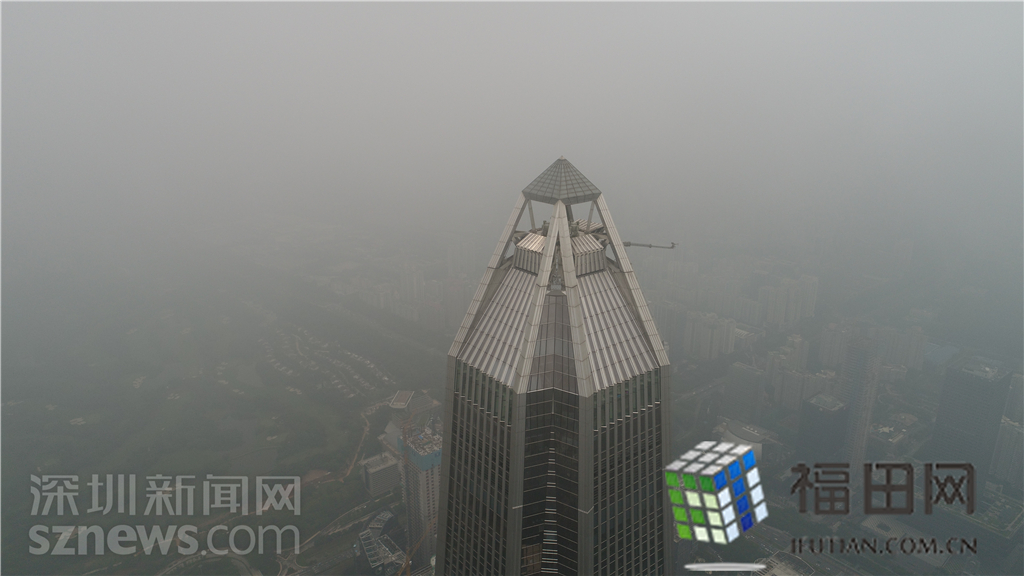 記者在福田中心區看到,大量的灰霾籠罩在城市上空,不少著名的地標性高樓大廈玩起了“隱身術”。比如,平安金融中心大廈若隱若現,在上午11時、下午4時等灰霾最嚴重時候甚至完全看不見。記者操作無人機航拍福田中心區的灰霾情況,在海拔500米左右的高空,無人機的視線就被灰霾完全擋住。距離不足一百米的平安金融中心都看不見任何蹤影。