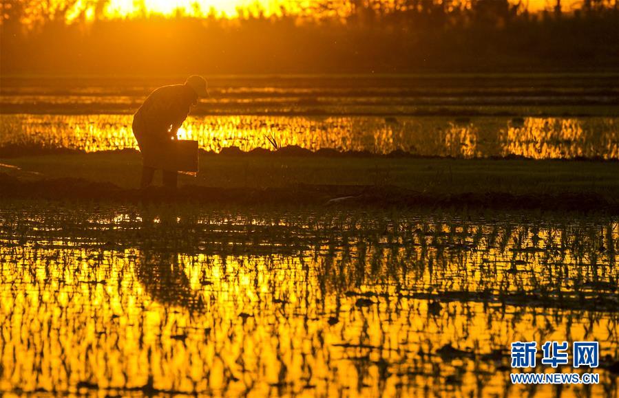 夕陽西下,村民在新疆察布查爾錫伯自治縣種羊場托海依村的一處農(nóng)田里勞動(5月21日攝)。近日,隨著氣溫漸高,地處新疆伊犁河谷的察布查爾錫伯自治縣迎來插秧高峰期,田間地頭一派繁忙景象。塊塊稻田水滿如鏡,田間防護林枝繁葉茂,遠(yuǎn)處雪山依稀可見,如一幅在大地上鋪展開的生態(tài)畫卷。新華社記者胡虎虎 攝