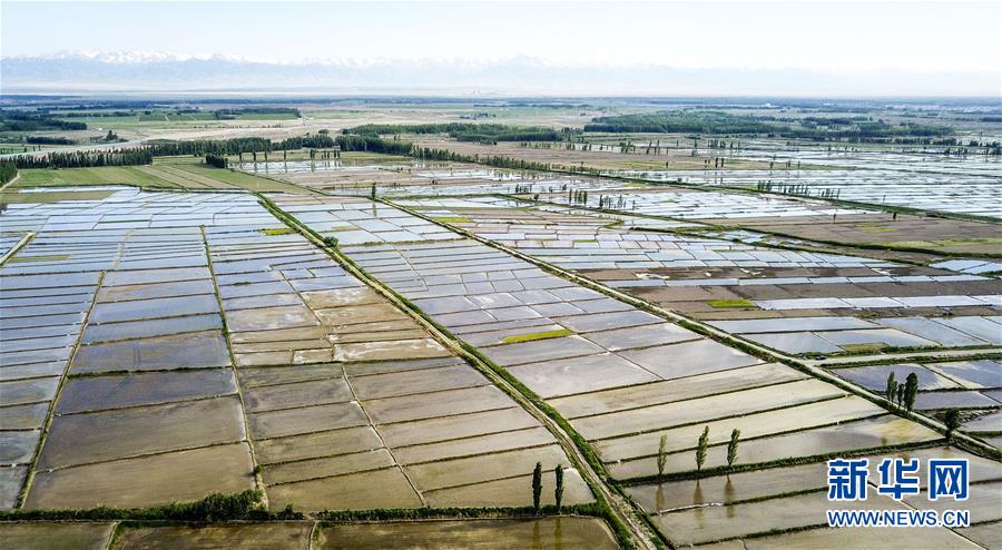 在新疆察布查爾錫伯自治縣扎庫齊牛錄鄉拍攝的一處水稻田(5月21日無人機拍攝)。近日,隨著氣溫漸高,地處新疆伊犁河谷的察布查爾錫伯自治縣迎來插秧高峰期,田間地頭一派繁忙景象。塊塊稻田水滿如鏡,田間防護林枝繁葉茂,遠處雪山依稀可見,如一幅在大地上鋪展開的生態畫卷。新華社記者胡虎虎 攝