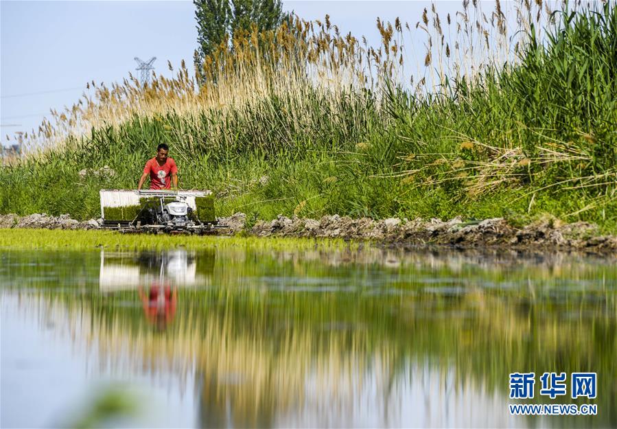 新疆察布查爾錫伯自治縣種羊場托海依村村民在農田里插秧(5月21日攝)。近日,隨著氣溫漸高,地處新疆伊犁河谷的察布查爾錫伯自治縣迎來插秧高峰期,田間地頭一派繁忙景象。塊塊稻田水滿如鏡,田間防護林枝繁葉茂,遠處雪山依稀可見,如一幅在大地上鋪展開的生態畫卷。新華社記者胡虎虎 攝