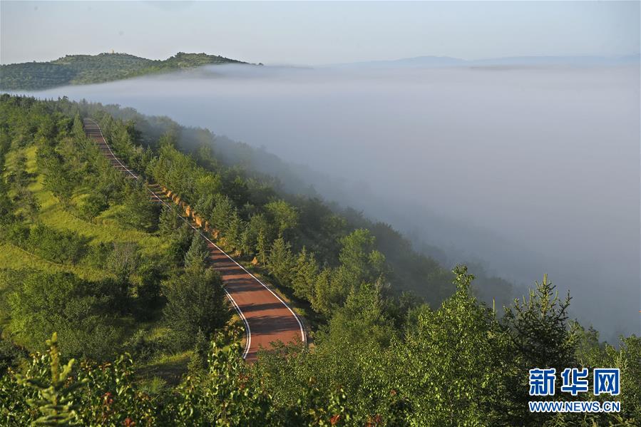 云霧繚繞的寧夏彭陽縣金雞坪梯田公園(7月17日攝)。新華社記者 王鵬 攝