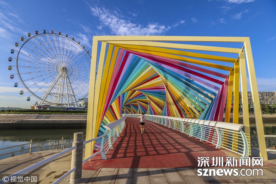 ????深圳新聞網訊? 2018年9月5日,山東青島,西海岸新區為唐島灣公園量身定制的“七彩橋”驚艷亮相,整個橋身色彩斑斕,造型別致。