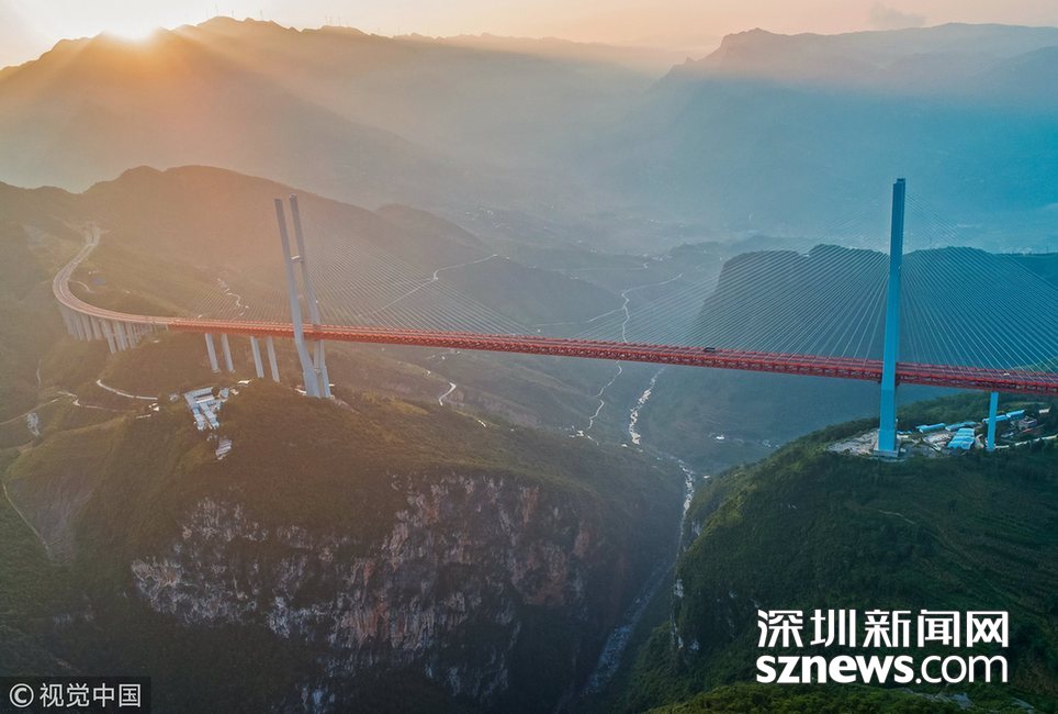 ??? 深圳新聞網訊? 畢都高速公路北盤江大橋是杭瑞高速公路畢都段的控制性工程,位于貴州省和云南省交界處,由貴州省和云南省共建。該橋橋面至江面高差達 565 米,成為目前世界第一高橋。主橋為鋼桁梁斜拉橋,主跨 720 米,目前位居同類型橋梁2016 年12 月 29 日正式通車。