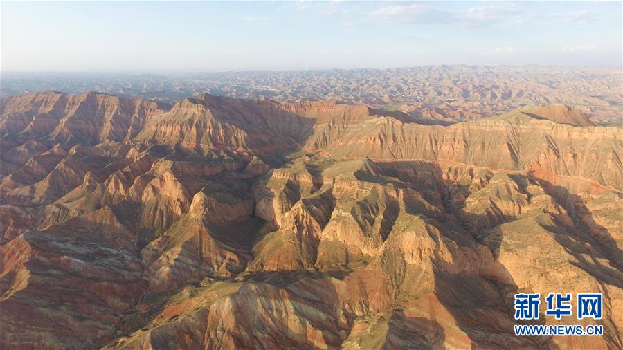這是7月15日拍攝的夕陽下的蘭州樹屏丹霞地貌。蘭州樹屏丹霞國家地質公園位于甘肅省蘭州市永登縣咸水河流域及其毗鄰地區,分布在蘭州市所屬的永登縣、皋蘭縣、西固區、安寧區,主體位于永登縣樹屏鎮、苦水鎮和西固區河口鎮。其主體地質遺跡為丹霞和彩色丘陵,登高遠眺,綿延起伏,絢爛瑰麗,如同大自然創作的壯美油畫。新華社記者陳曄華 攝
