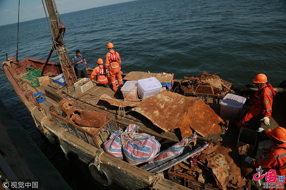 2018年9月25日,遼寧大連,考古工作人員把出水的經(jīng)遠(yuǎn)艦遺物進(jìn)行轉(zhuǎn)運(yùn)。視覺(jué)中國(guó)