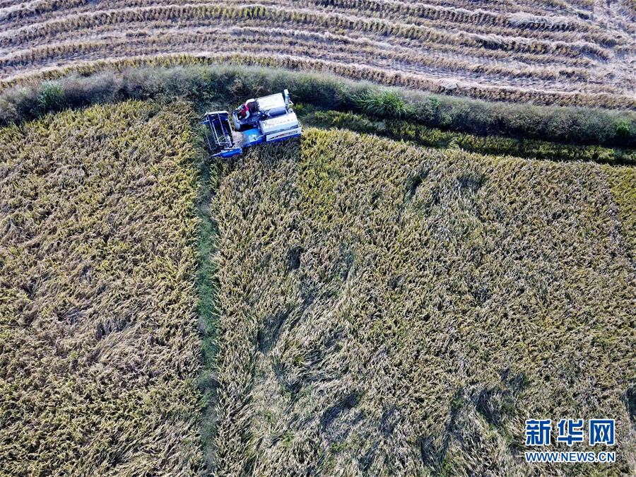 9月27日,在鳳陽縣小崗村,農民駕駛收割機收割水稻(無人機拍攝)。新華社記者 劉軍喜 攝