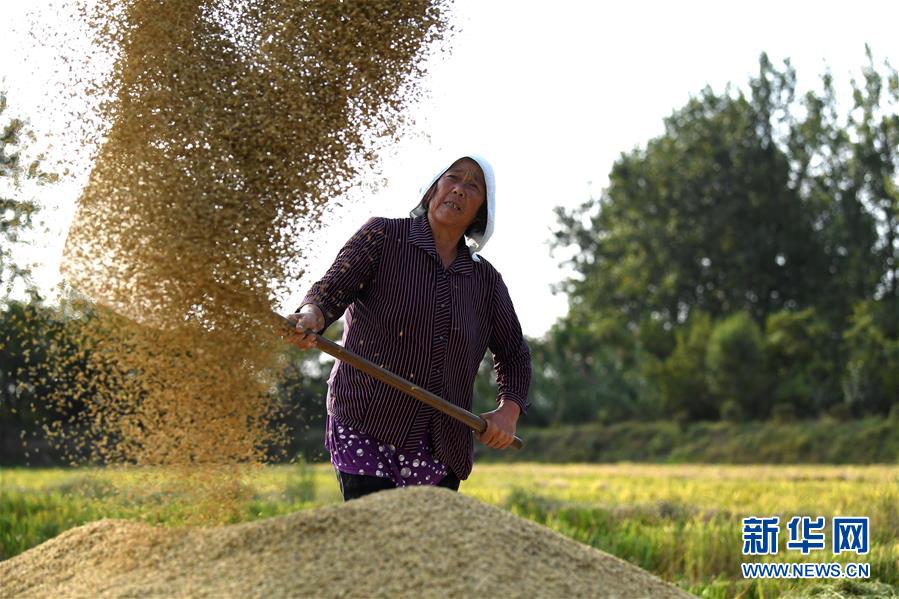 正值秋收時節,安徽省鳳陽縣小崗村水稻陸續成熟,進入收割期。當地農民利用晴好天氣搶收水稻,確保顆粒歸倉。