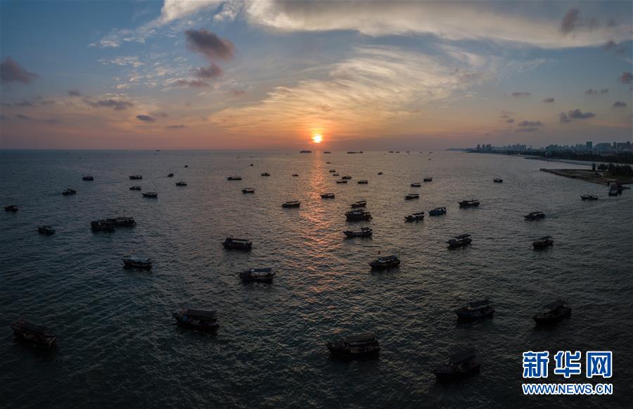 這是夕陽西下時,漁船從廣西北海市銀灘風景區出海作業(9月26日無人機拍攝,拼接照片)。 新華社記者 李鑫 攝