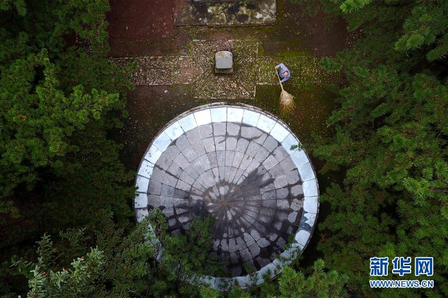 在黃崖洞烈士陵園,趙乃堂在清掃落葉(9月20日無人機拍攝)。 新華社記者 詹彥 攝