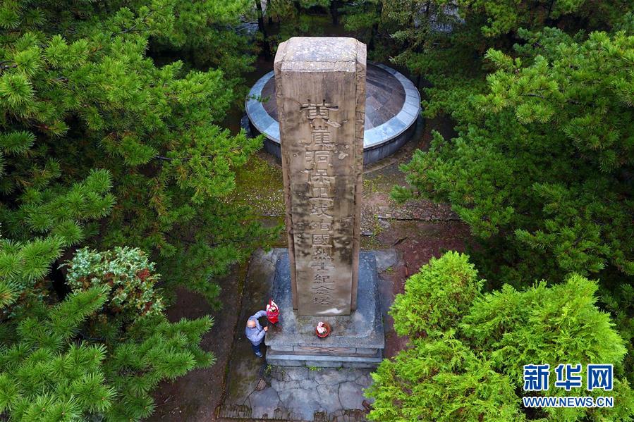 在黃崖洞烈士陵園,趙乃堂將花擺在黃崖洞保衛(wèi)戰(zhàn)殉國(guó)烈士紀(jì)念塔前(9月19日無(wú)人機(jī)拍攝)。 新華社記者 詹彥 攝