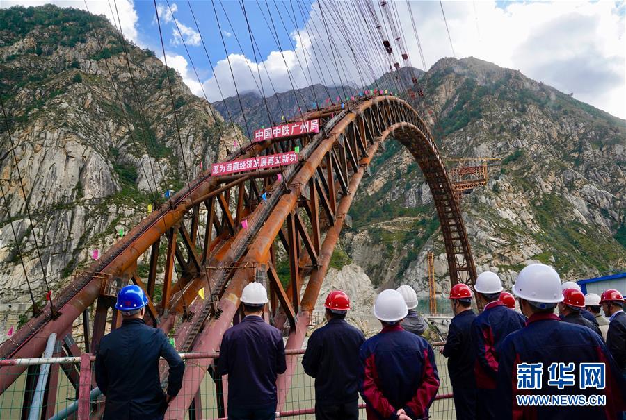 9月28日拍攝的川藏鐵路拉林段重點標(biāo)志性工程藏木特大橋合龍儀式現(xiàn)場。 當(dāng)日,隨著最后一節(jié)鋼管拱的對位和鎖定完畢,川藏鐵路拉林段藏木特大橋成功合龍,標(biāo)志著大橋主體結(jié)構(gòu)施工取得了關(guān)鍵性勝利。藏木特大橋由中國中鐵廣州局集團(tuán)承建,拱高112米,橋橫跨雅魯藏布江峽谷,水深66米。 新華社記者普布扎西攝