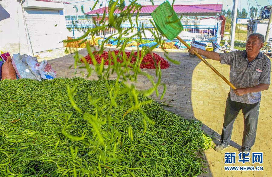 9月28日,饒陽縣留楚鄉影林村的種植戶在翻晾辣椒。 近年來,河北省饒陽縣結合市場需求,積極引進特色品種辣椒種植,開辟出一條農民增收致富新路。目前,該縣特色辣椒種植面積1000余畝,種植戶年均增收3000余元。 新華社記者 李曉果攝