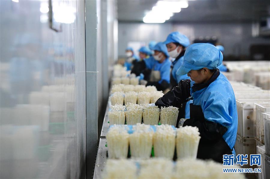 在位于清豐縣的河南龍豐實業股份有限公司,工人在包裝車間流水線上采摘、分揀金針菇(9月28日攝)。新華社記者馮大鵬攝