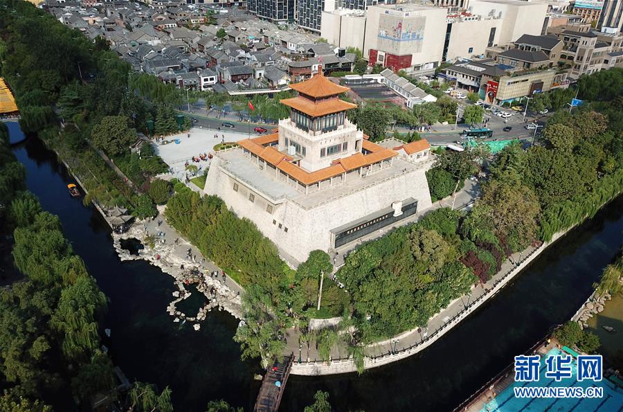 9月30日,游客在免費開放的濟南市黑虎泉游覽(無人機拍攝)。近年來,山東積極推進國有景區免費開放工作,截至目前,山東實現免費開放的國有景區已達286處。新華社記者徐速繪攝