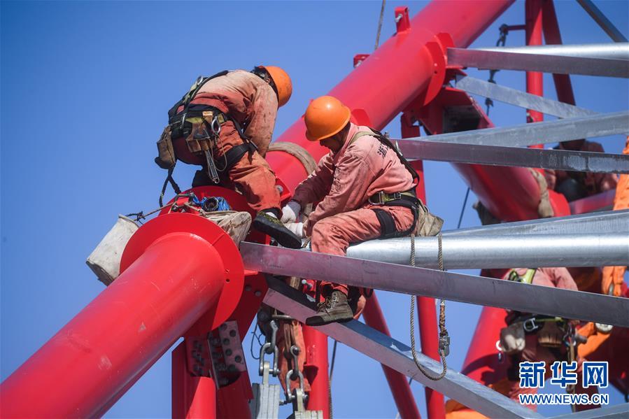 10月1日,工作人員在浙江舟山500千伏聯網輸變電工程金塘島380米輸電鐵塔上施工。當日是國慶節,許多勞動者堅守在工作一線,在崗位上度過節日。新華社記者徐昱攝