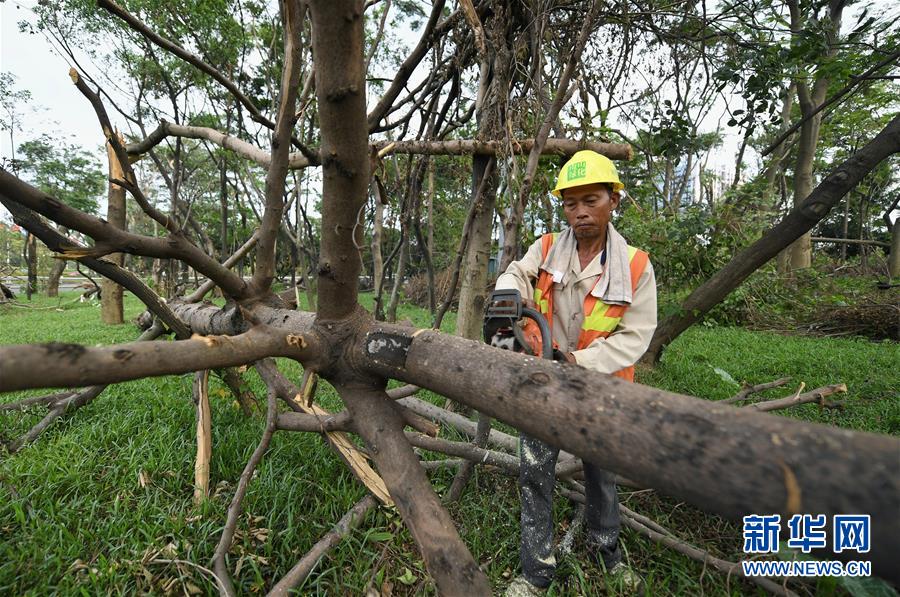 10月1日,工作人員在深圳街頭的綠化帶清理強臺風“山竹”損毀的樹木。當日是國慶節,許多勞動者堅守在工作一線,在崗位上度過節日。新華社記者毛思倩攝