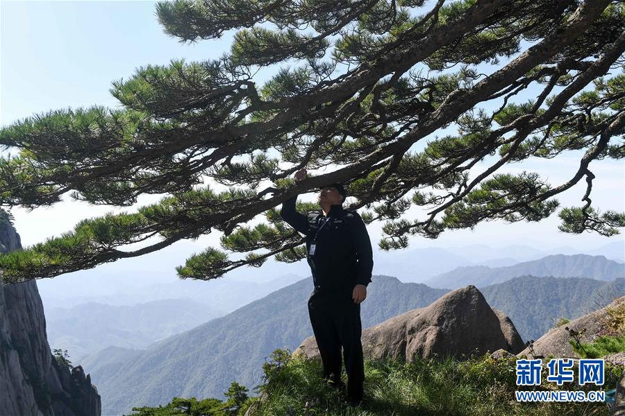 10月1日,安徽黃山風景區管委會園林局迎客松專職守護人胡曉春在對迎客松進行巡查。當日是國慶節,許多勞動者堅守在工作一線,在崗位上度過節日。新華社記者張端攝