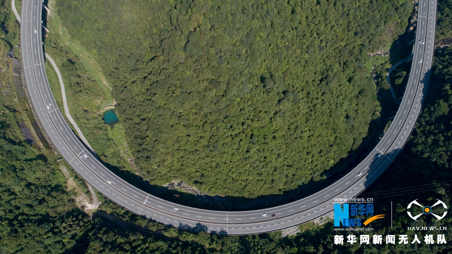 這是廈蓉高速長下坡龍巖路段的道路景觀,高速路走向形成罕見的半圓形。改擴建工程竣工之后,長下坡將改成上行線,變為上坡路段(無人機拍攝)。新華網 肖和勇 攝