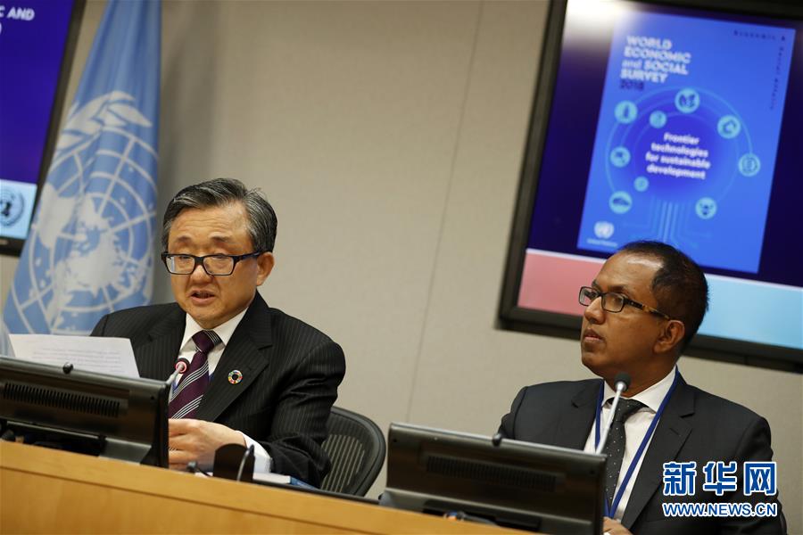 10月8日,在位于紐約的聯合國總部,聯合國負責經濟和社會事務的副秘書長劉振民(左)向記者介紹《2018年世界經濟和社會概覽》。新華社記者李木子攝