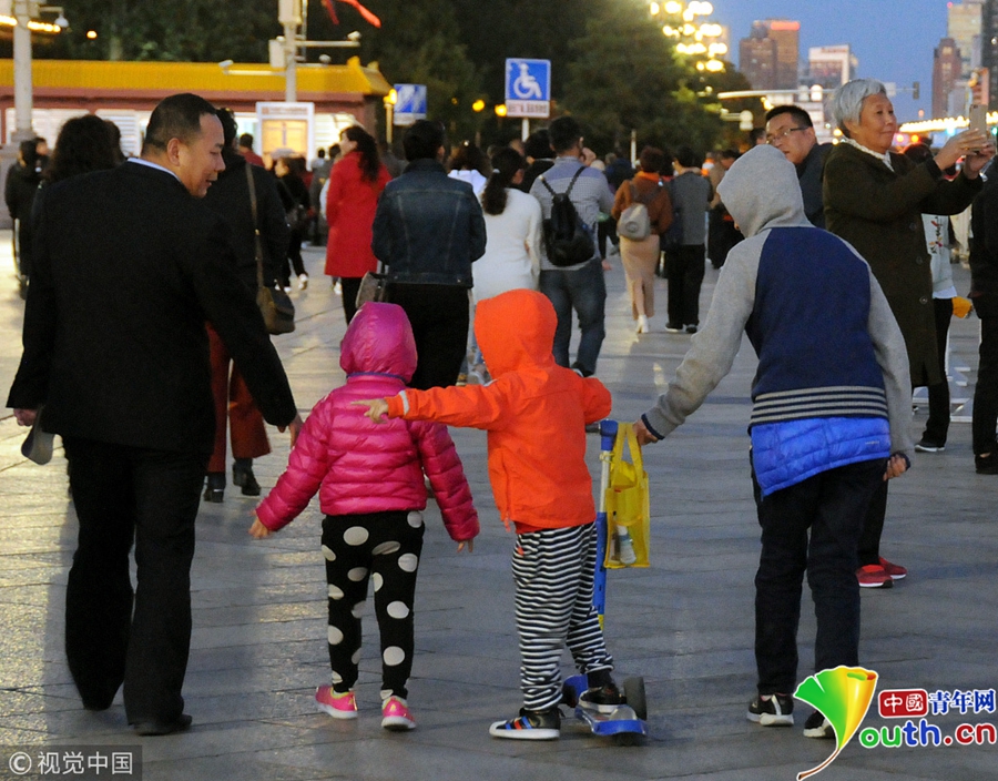 中國(guó)青年網(wǎng)北京10月10日電 2018年10月9日,北京,游客紛紛著秋冬裝游覽天安門廣場(chǎng)。當(dāng)天北京冷空氣來(lái)襲。圖片來(lái)源:視覺中國(guó)