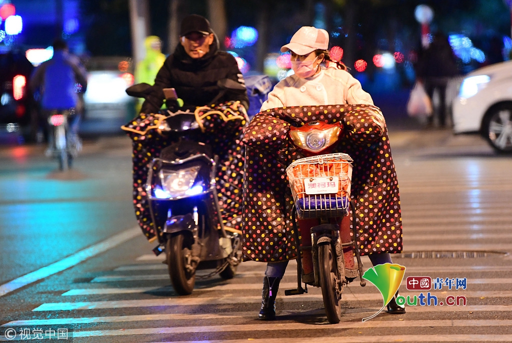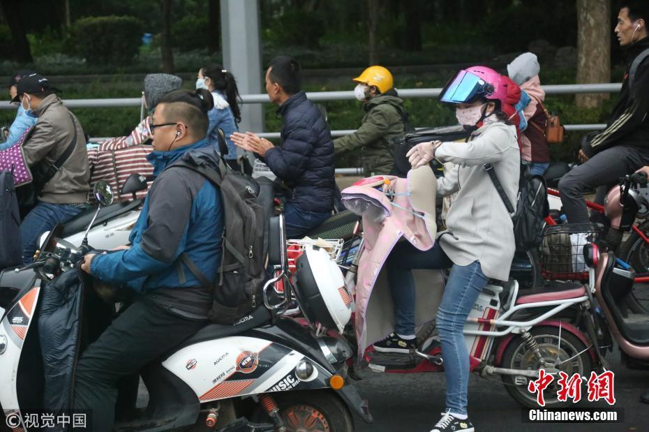 2018年10月9日,山東濟(jì)南,昨日一場(chǎng)秋雨過(guò)后開始降溫,今天清晨最低氣溫只有6度,馬路上不少上班族穿上羽絨服騎車趕上班路。 圖片來(lái)源:視覺中國(guó)