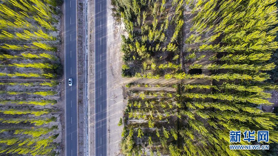 車輛行駛在新疆阿克蘇地區柯柯牙綠化工程核心區(9月20日無人機拍攝)。 在世界第二大流動性沙漠——塔克拉瑪干沙漠西北邊,一條逾百萬畝的人工林帶傲然挺立。 這條林帶就是柯柯牙荒漠綠化工程。它是新疆阿克蘇黃沙漫漫和碧波萬頃的分界嶺。 1986年,為改變惡劣的自然條件,阿克蘇啟動柯柯牙綠化工程。30年間,各族干部群眾攜手奮斗,曾是沙塵暴策源地的柯柯牙綠樹成蔭;并以此為原點,在南疆戈壁荒灘上孕育出百萬畝的“綠海”。 30多年來,阿克蘇打造出“人走政不息”的樣本,使綠色發展理念成為幾代人的廣泛共識;“自力更生、艱苦奮斗、無私奉獻”的柯柯牙精神,已融入各族兒女血液中;“以林養林”“邊綠化邊脫貧”的綠化、脫貧方式,給其他荒漠地區貢獻了“柯柯牙智慧”。 新華社記者 胡虎虎 攝