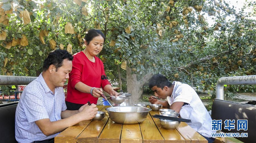 甘永軍(左一)在地處新疆阿克蘇地區(qū)柯柯牙綠化工程內(nèi)的果園吃飯(2017年9月22日攝)。10年前,甘永軍還在果園開起了第一個(gè)農(nóng)家樂,帶動(dòng)周邊100多戶果農(nóng)經(jīng)營起了自家庭院。 在世界第二大流動(dòng)性沙漠——塔克拉瑪干沙漠西北邊,一條逾百萬畝的人工林帶傲然挺立。 這條林帶就是柯柯牙荒漠綠化工程。它是新疆阿克蘇黃沙漫漫和碧波萬頃的分界嶺。 1986年,為改變惡劣的自然條件,阿克蘇啟動(dòng)柯柯牙綠化工程。30年間,各族干部群眾攜手奮斗,曾是沙塵暴策源地的柯柯牙綠樹成蔭;并以此為原點(diǎn),在南疆戈壁荒灘上孕育出百萬畝的“綠海”。 30多年來,阿克蘇打造出“人走政不息”的樣本,使綠色發(fā)展理念成為幾代人的廣泛共識(shí);“自力更生、艱苦奮斗、無私奉獻(xiàn)”的柯柯牙精神,已融入各族兒女血液中;“以林養(yǎng)林”“邊綠化邊脫貧”的綠化、脫貧方式,給其他荒漠地區(qū)貢獻(xiàn)了“柯柯牙智慧”。 新華社記者 杜剛 攝