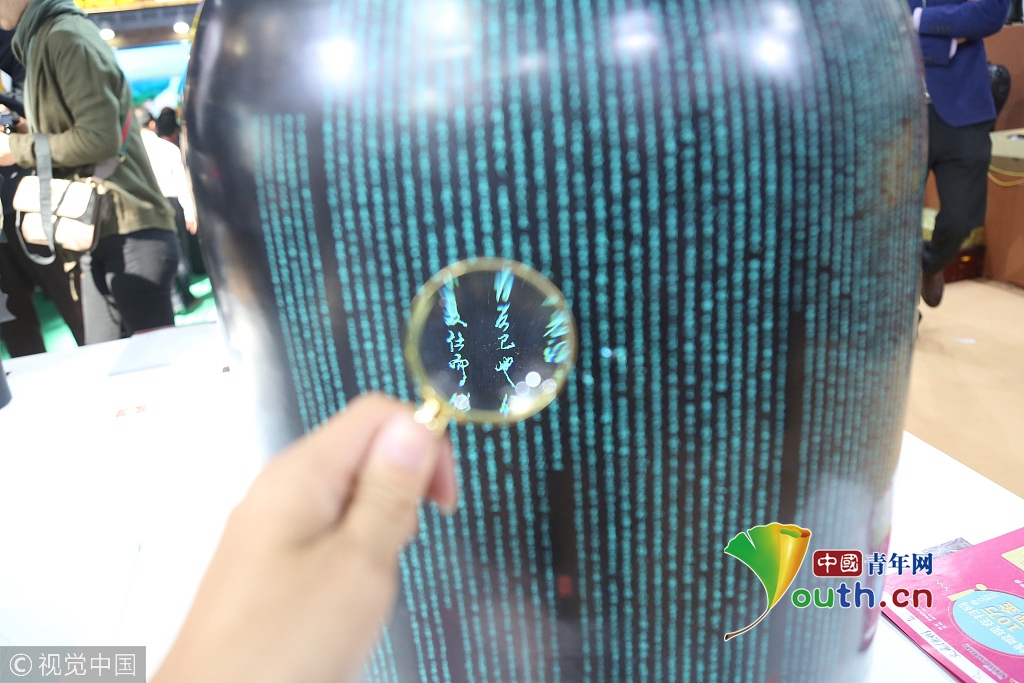 2018年10月14日,山東濟(jì)南,高新會(huì)展中心濟(jì)南文博會(huì)現(xiàn)場(chǎng),張務(wù)福老先生在黑陶鼎上刻字。