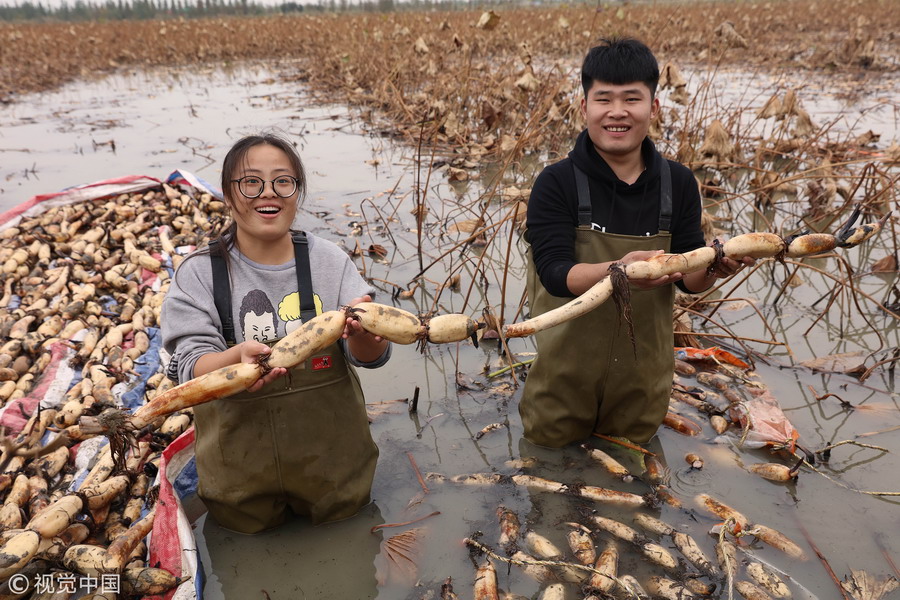 2018年10月14日,江蘇宿遷,泗洪縣曹廟鄉瓦廟村村民在藕蝦共作基地參加挖藕比賽。