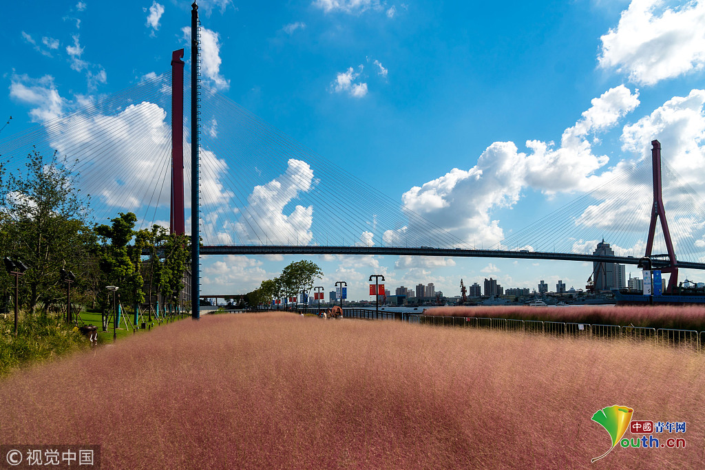 2018年9月28日,上海,東外灘楊浦濱江的粉黛亂子草目前已進入盛花期,當日早間,不少市民來到濱江拍照賞景,成片的紫色花海在藍天白云映襯下美不勝收。圖片作者:王岡/視覺中國
