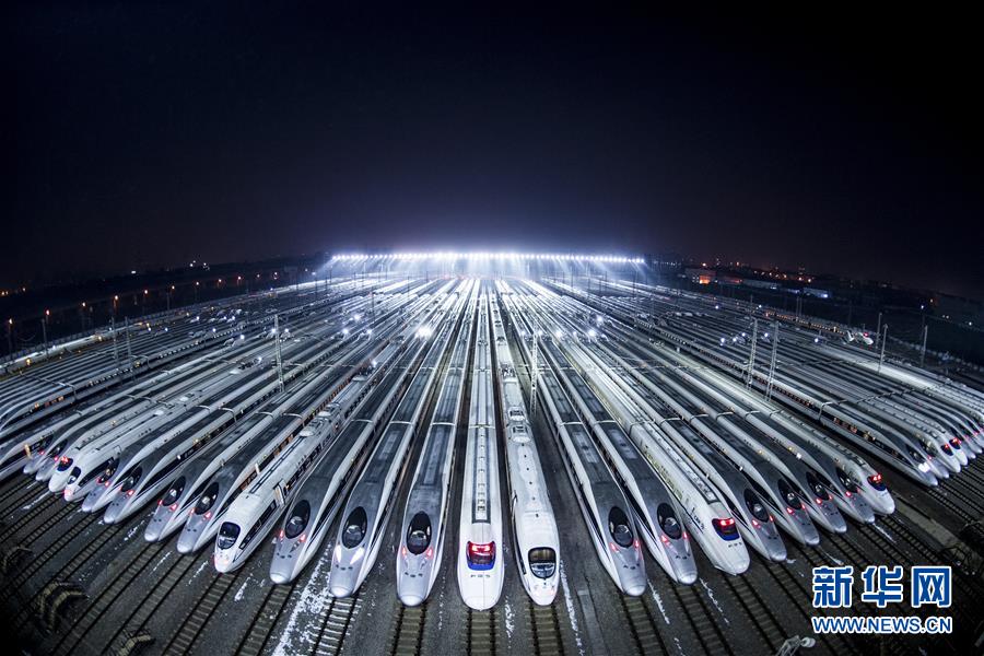 2018年2月1日凌晨,動車組??吭谖錆h動車段的存車線上,準備進行檢修和保溫作業。近百組在武漢動車段經過檢修、保溫作業的動車組蓄勢待發,迎接春運。新華社記者 肖藝九 攝