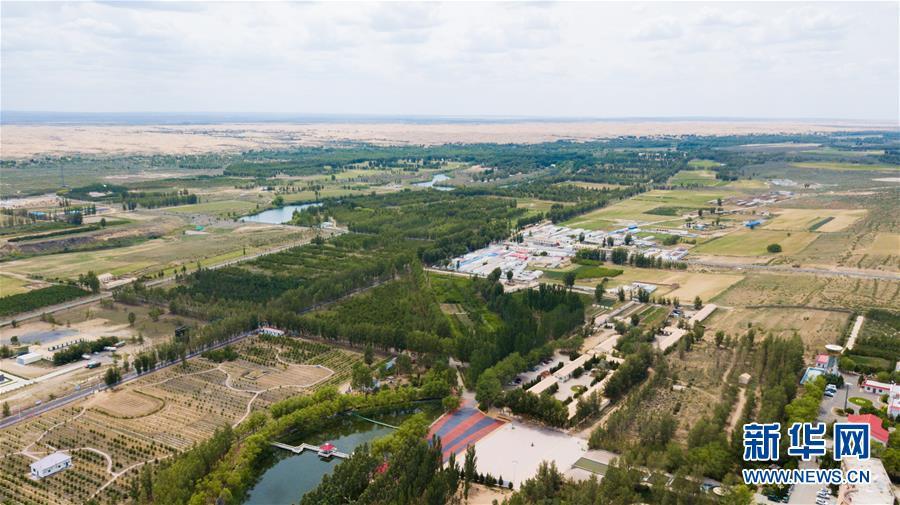 地處庫布其沙漠的恩格貝景區(6月8日無人機拍攝)。