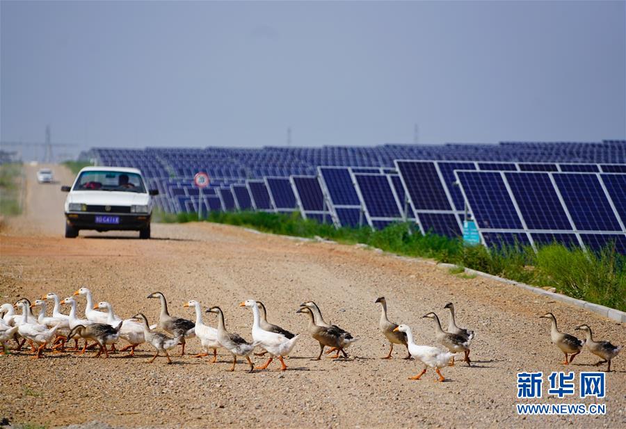 這是內蒙古鄂爾多斯市杭錦旗庫布其沙漠生態太陽能光伏光熱治沙發電綜合示范地(8月1日攝)。“板上發電、板下種草、板間養殖”,目前該太陽能發電項目治沙面積達到了13.3平方公里,每年發電5億千瓦時,實現銷售收入4.5億元。其社會效益、生態效益、民生效益、經濟效益十分顯著。