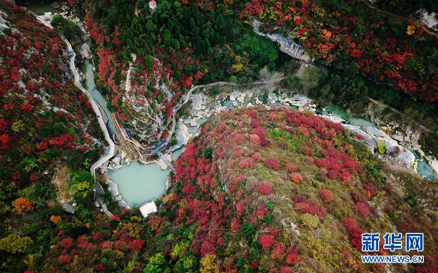金秋時節,甘肅省隴南市成縣西狹頌景區層林盡染,峽內石崖、池潭、樹木、山峰構成五彩斑斕的秋日美景圖,引人入勝。