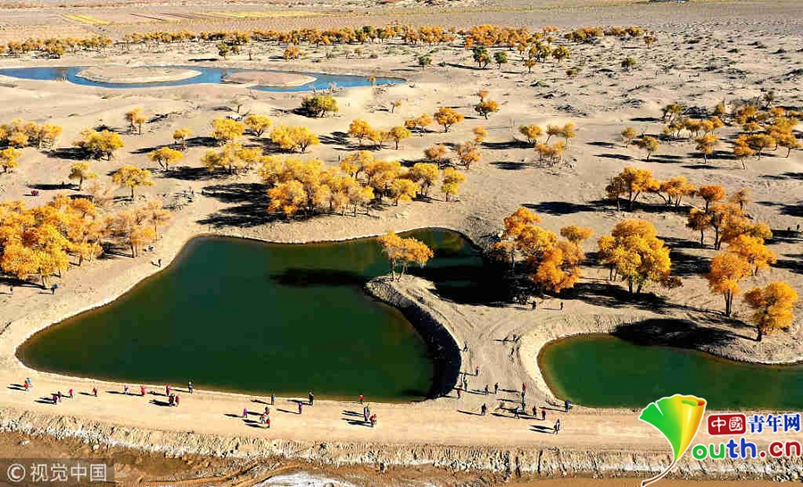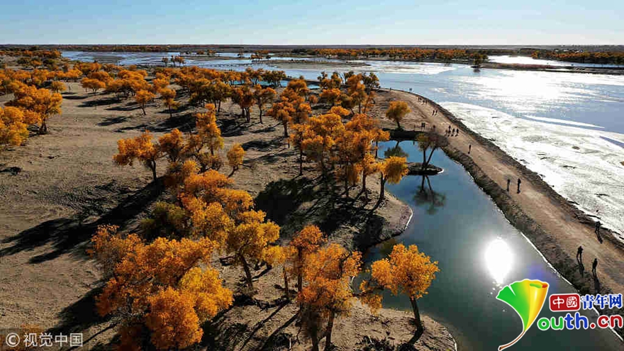 中國青年網北京10月9日電 2018年10月7日至8日,內蒙古自治區阿拉善盟額濟納旗,地處巴丹吉林沙漠。額濟納河兩岸壯觀的胡楊林堪稱大漠的一顆綠色明珠,每年深秋時節的第一場秋霜過后,大片的胡楊樹葉由綠變黃,一眼望去,陽光下金色的樹葉襯著湛藍的天空于風中婆娑起舞,鮮明的影調,亮麗的色彩,令人流連忘返。