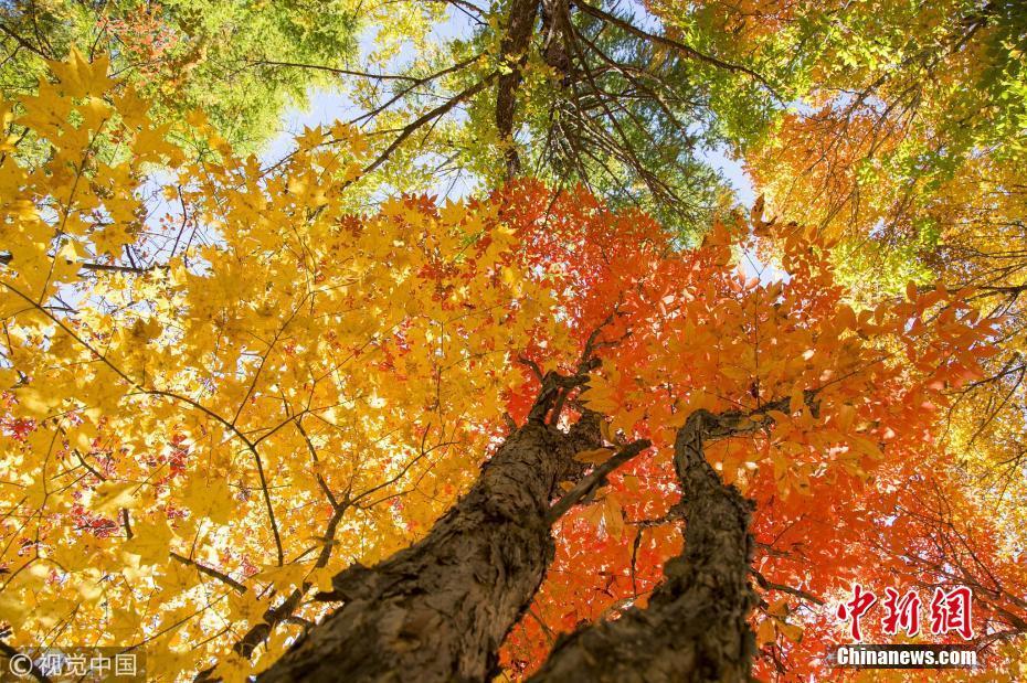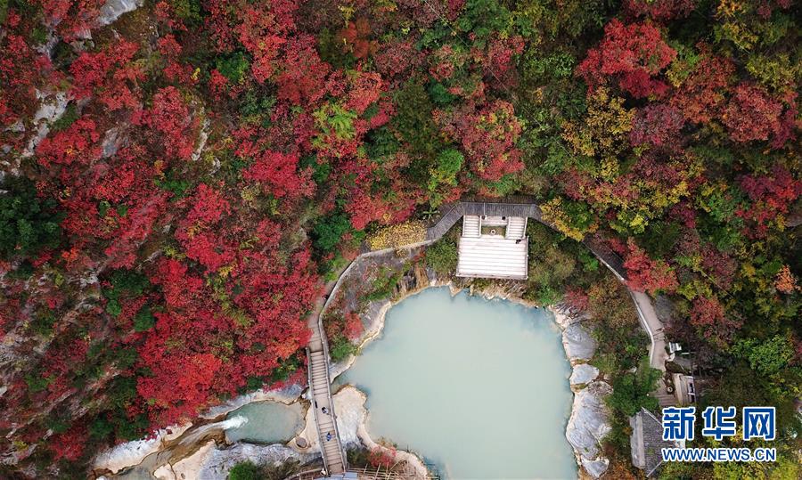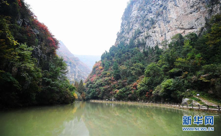 金秋時節,甘肅省隴南市成縣西狹頌景區層林盡染,峽內石崖、池潭、樹木、山峰構成五彩斑斕的秋日美景圖,引人入勝。