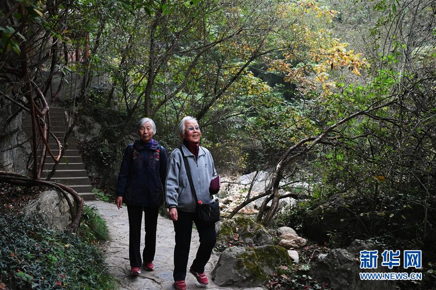 10月16日,兩位老人在西狹頌景區內游覽。 新華社記者 陳斌 攝