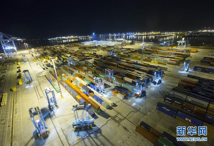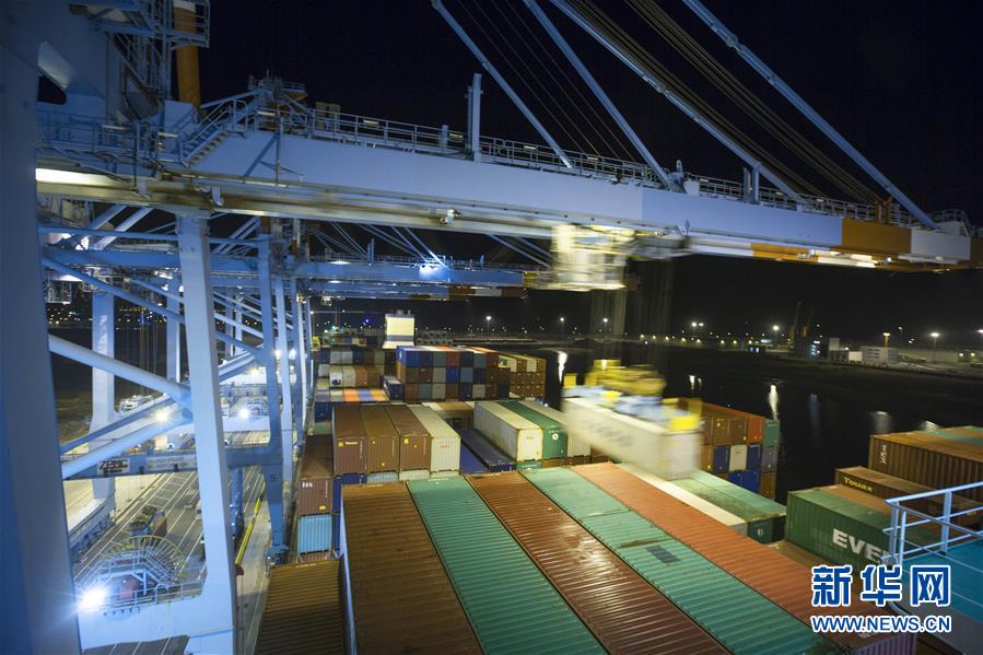 這是10月15日晚在比利時澤布呂赫港拍攝的正在進行裝卸作業的集裝箱碼頭。新華社記者 葉平凡 攝