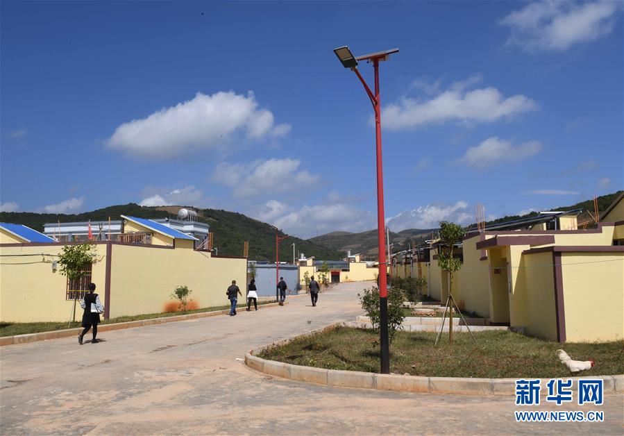 10月16日,人們行走在硯山縣小補佐村的道路上。 云南省文山壯族苗族自治州硯山縣稼依鎮小補佐村有55戶200多名壯族群眾曾經居住在大山深處。2017年10月,在政府的幫扶下,小補佐村易地扶貧建設新村,村民全部搬遷入住新居。 新華社記者 楊宗友 攝
