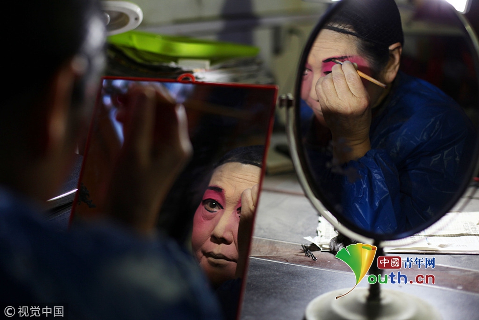 2016年3月10日,陜西安康,今年70歲的劉鳳鳴10歲時開始學漢調二黃,40歲時從廁所抱回智殘體殘棄嬰,因為對藝術的熱愛、對生命的敬畏她選擇了不離不棄。人生如戲,戲如人生。劉鳳鳴說,像她們這樣的業余劇團,沒有專門的化妝師,她要求每個演員必須學會化妝。圖片作者:魏永賢/視覺中國