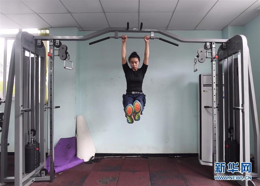 10月16日,湯春燕在健身房內進行擒敵訓練。 新華社記者王全超攝