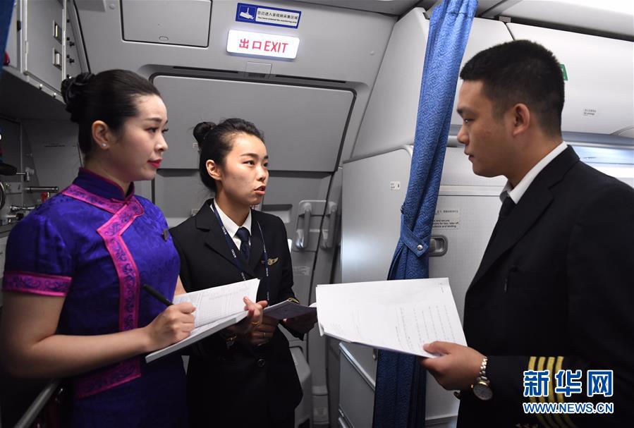 10月16日,湯春燕(中)參加航前機組協同準備會。 新華社記者王全超攝