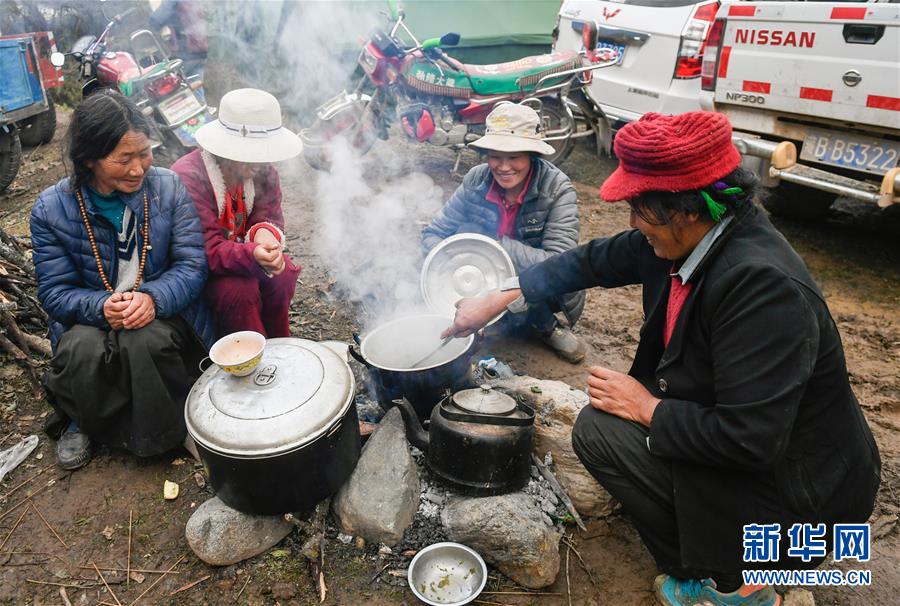 波羅鄉一臨時安置點內的群眾在燒水做飯(10月14日攝)。 新華社記者 劉東君 攝