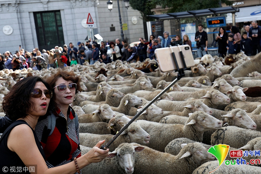 西班牙牧羊人驅(qū)趕羊群穿越馬德里 羊群進(jìn)城“參觀(guān)”