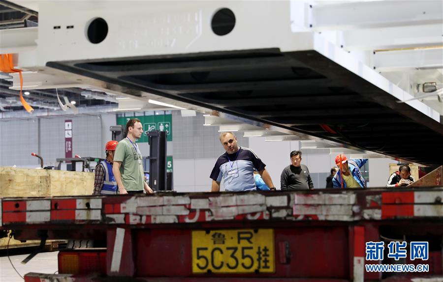 10月22日,德國工程師馬丁·霍爾茨海德(中)在吊裝過程中查看“金牛座”龍門銑床床身位置。 當日,來自德國的首屆進口博覽會最大展品——“金牛座”龍門銑床完成初步組裝,將運往國家會展中心(上海)3號館進行最后的安裝施工。這是德國瓦德里希科堡公司研發的機床設備,高約8米,占地面積約200平方米,將在智能及高端裝備區進行展出。 新華社記者方喆攝