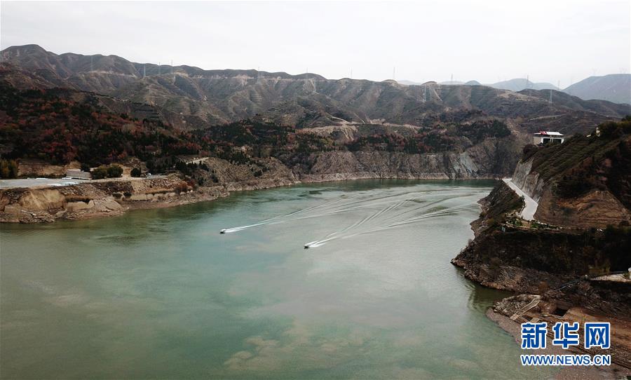 10月24日,兩艘快艇從劉家峽水庫庫區駛過(無人機拍攝)。 新華社記者 陳斌 攝