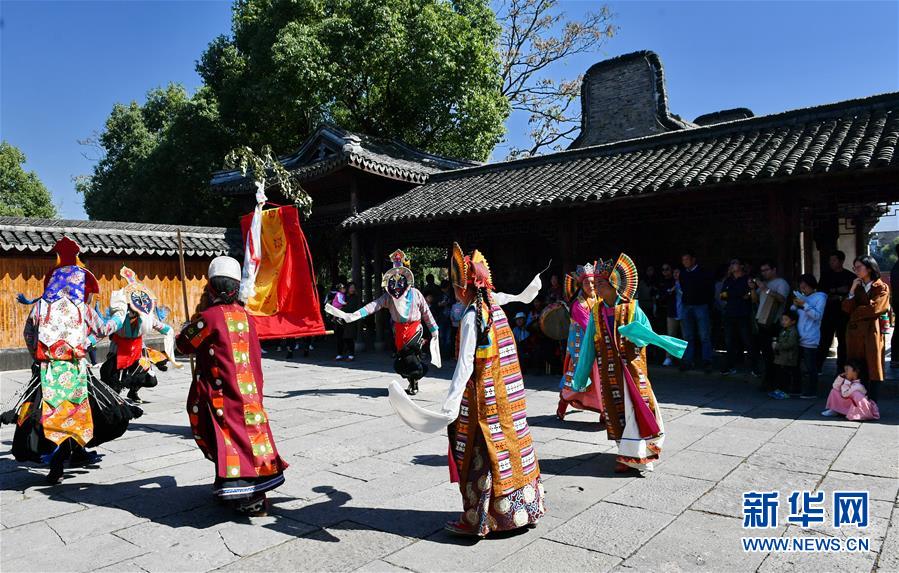 在浙江烏鎮西柵景區的安渡坊碼頭廣場上,西藏迥巴藏戲隊表演藏戲《頓月頓珠》(10月27日攝)。新華社記者 張汝鋒 攝