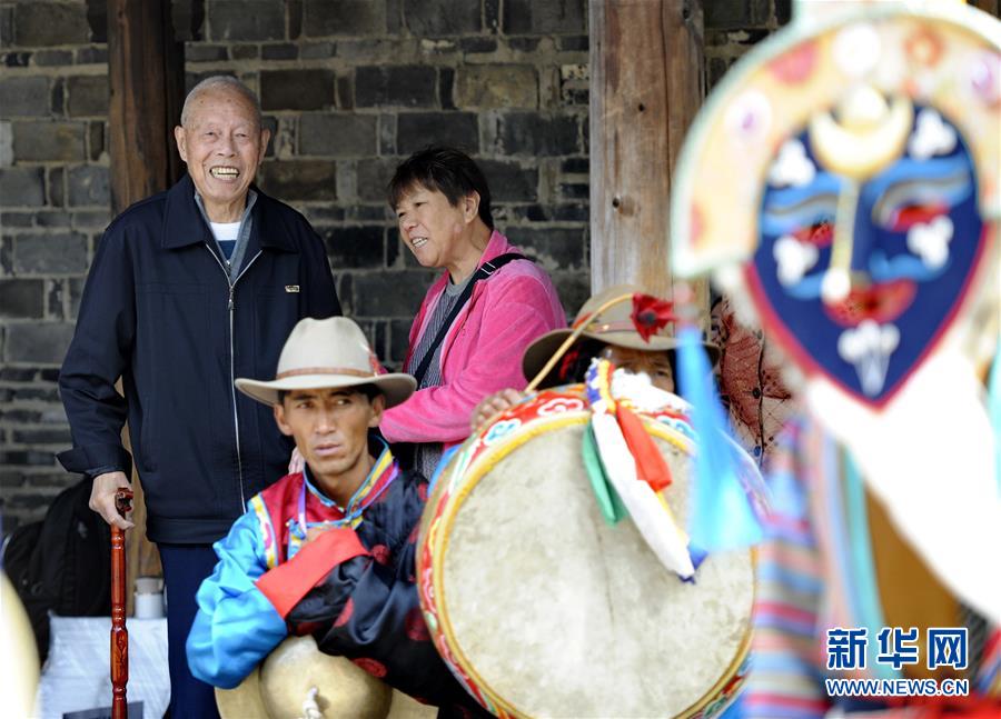 在浙江烏鎮西柵景區的安渡坊碼頭廣場的涼亭下,來自無錫的90歲鄧氏老人(左一)觀看藏戲表演(10月26日攝)。新華社記者 張汝鋒 攝