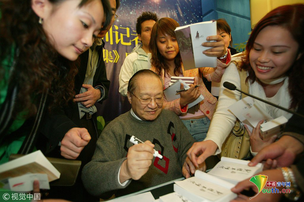 2005年12月17上午,中國南北文壇兩位大俠金庸和二月河在深圳五洲賓館和各地記者進行了一場精彩對話。金庸迷找金庸簽名。圖片作者:北辰